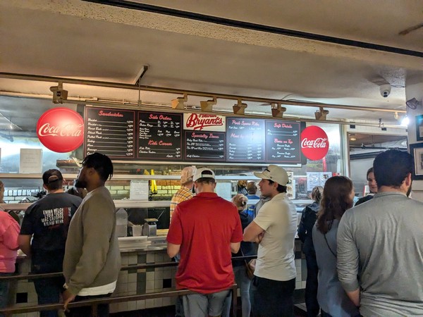 We arrived to stand in a long line (a good sign!) in order to approach the cafeteria-style ordering windows. We noted pictures of both Obama, but also John McCain and others. When we reached the first carver, we were coached on how much meat to order (lots!) and not to order the baked potato (it doesn’t exist!). In a unique twist, they tried to frost my plastic cup for beer.