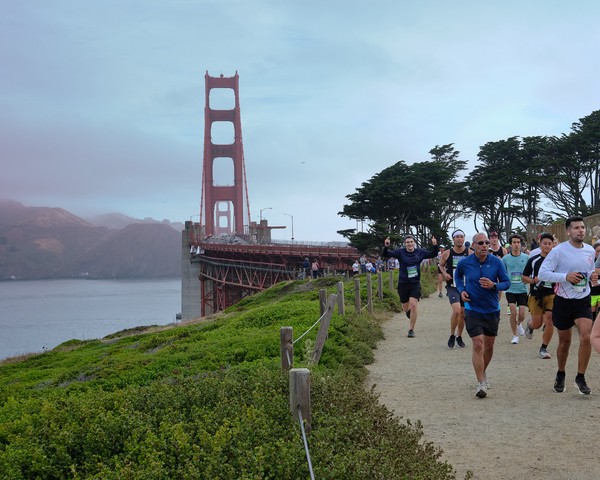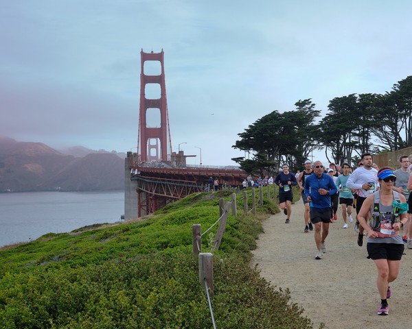 Micah’s start time at Crissy Field was about 6:50 am. The run would take him to Fort Point, then up a steep grade to the Bridge. The top of this grade was my first lookout. Then across the Golden Gate Bridge, up and down some challenging hills near Sausilito, back again across the Bridge, and to a finish in Golden Gate Park.