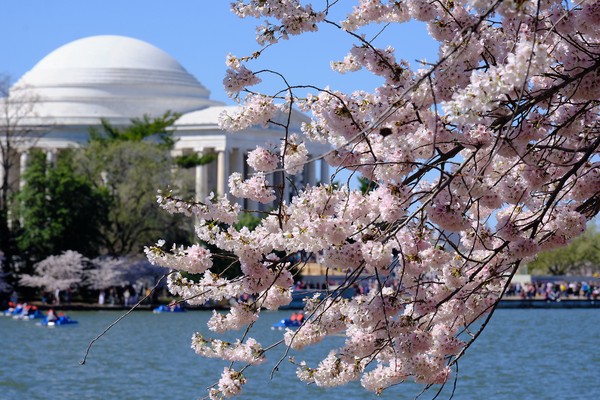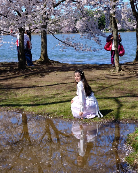 We did eventually make to see Thomas Jefferson in his architectural splendor. But the blossoms stole the show. I couldn’t stop snapping images. Many people were all dressed up to take family photos, including a Japanese girl who found a puddle to create a reflection.