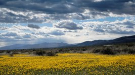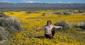 We first struck gold in the Mojave Desert, when we came across huge superblooms of “Desert Gold” flowers covering the sandy basin. The air was clear and the views were vast. Behind us, we could see the micro-burst storm clouds that had pelted our car with rain in the Tehachapi Pass. Ahead of us, an AirBnB awaited in sunny Ridgecrest, California.