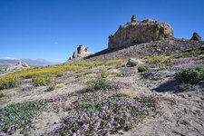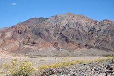 Then we ventured out further in Badwater Basin to an abandoned mining site called Ashford Mills, which was a good place for a picnic lunch. Purple and yellow wildflowers dotted the desert floor, leading up the colorful mountains. Notice the green colors on the mountain; that’s plants growing due to the recent rains. Overall that green is a rare sight.