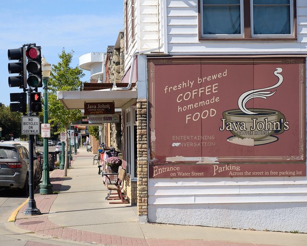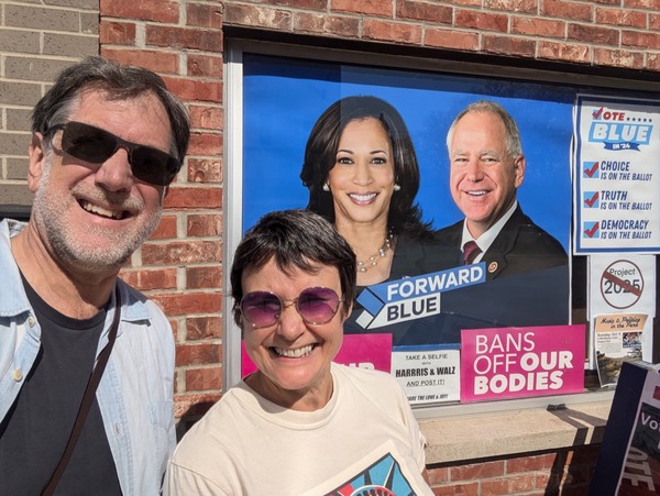 We wandered through the town, which features an extensive Norwegian museum called Vesterheim. A wonderful organic cafe served lunch bowls; I had one with Babaganoush. We also stopped by the Democratic headquarters, and I purchased some feminist postcards for Audrey. Click for bigger photos.