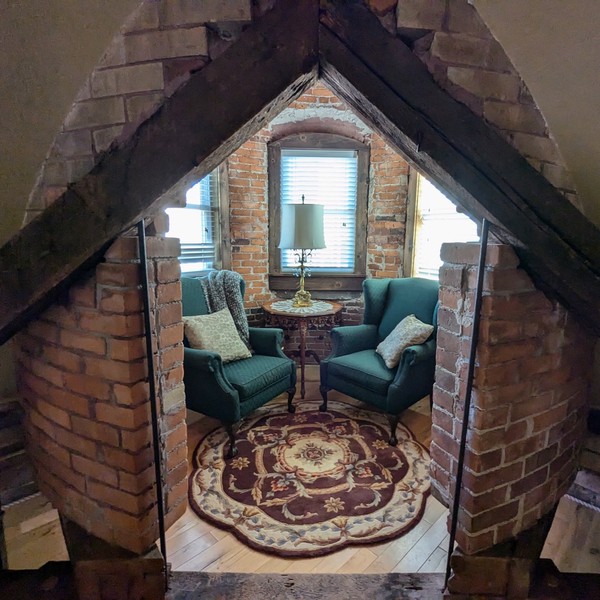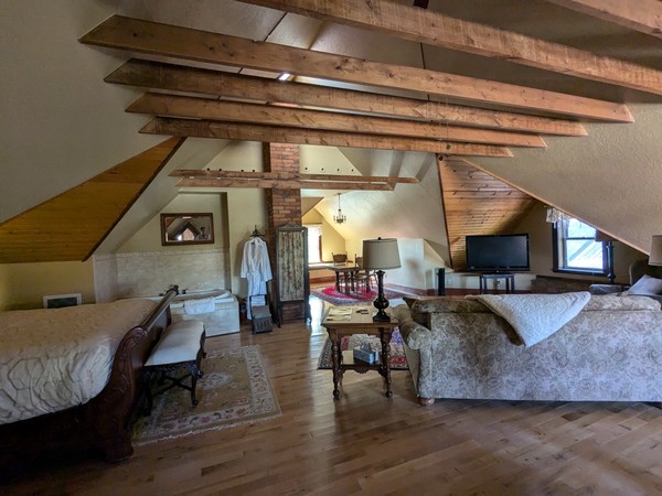 We started with a tour of the 1910, 5-bedroom inn. I enjoyed the period living room and main guest rooms upstairs. But then Melissa invited me up a narrow set of stairs to the top floor. It opened onto an amazing suite, with a turreted tower as the perfect reading room. What an amazing space! I’ll be back. Click any picture for bigger images.